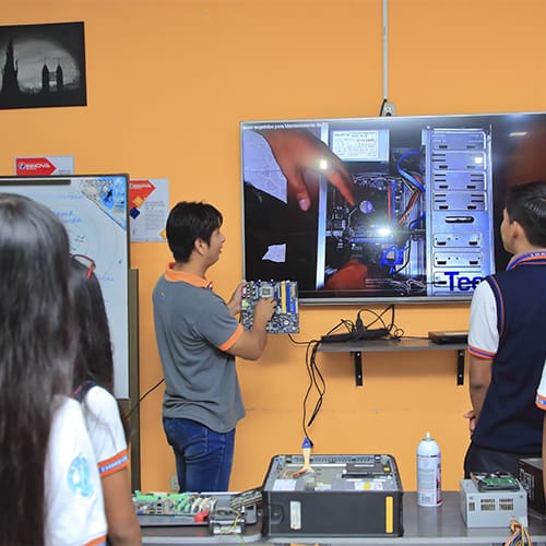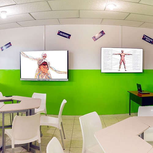 Todas las Aulas cuentan con los espacios pedagógicos adecuados, equipados con modernos y amplios Smart TV, proyector, audio, pizarra, internet y cámaras de seguridad con permanente monitoreo.